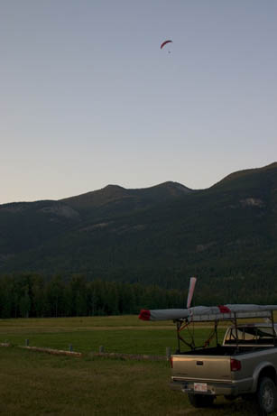 The landing field, Friday night. A paraglider circles overhead. The peak just to the left of centre is launch.
