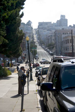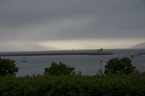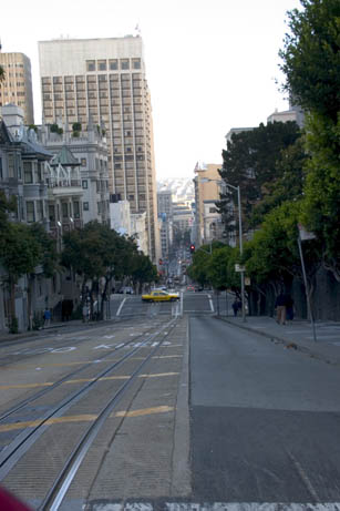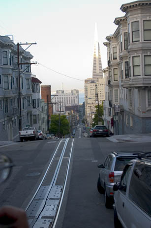 The fog started rolling it, it got cold and looked like rain so we hopped a cable car back. These pictures are hanging off the side of the cable car, dodging cars and street signs.