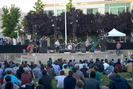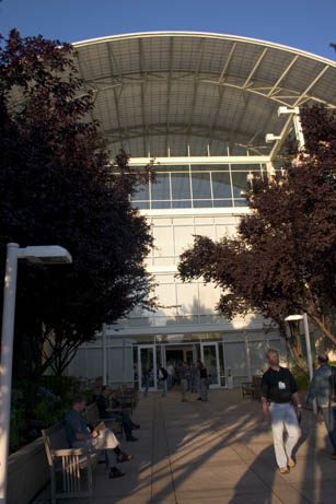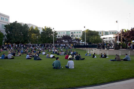 Inside... geeks eating. There were quite a few notebooks in evidence here too (we left ours at home and brought cameras instead). This is the quad at the heart of the Apple campus.