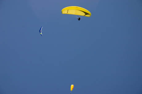My camera went down to wait at the landing field. Here's me, playing in the air over launch. Okay, since it was my first high flight maybe not playing so much as trying to loosen my death grip on the control bar.