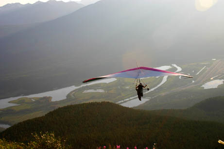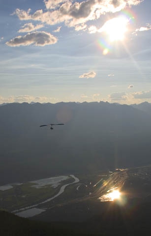 A few of us budding hang glider pilots took a weekend to participate in a course introducing us to mountain flying. With Steve to boot us off the mountain and John to welcome us back to the ground in the landing field (hopefully), we flew from launch, 6400 feet above sea level to the landing field, 3400 feet lower and four kilometres away. An average flight was about fifteen minutes. Thanks to John and Steve our instructors, Taylor and Pam for taking pictures when I was in the air, and Taylor, Pam and Katie for driving.
