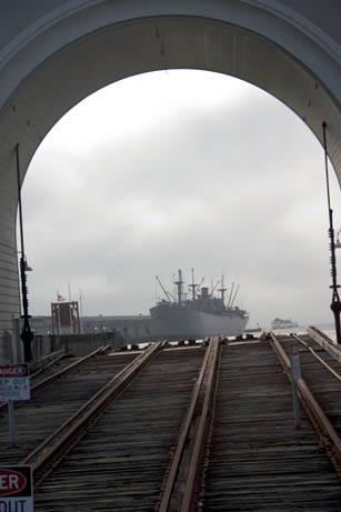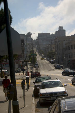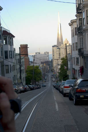The fog started rolling it, it got cold and looked like rain so we hopped a cable car back. These pictures are hanging off the side of the cable car, dodging cars and street signs.