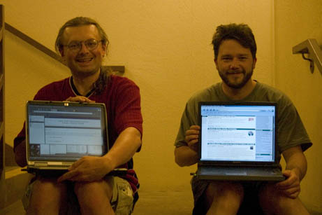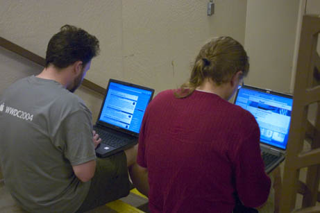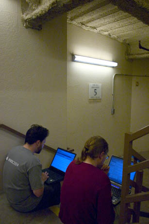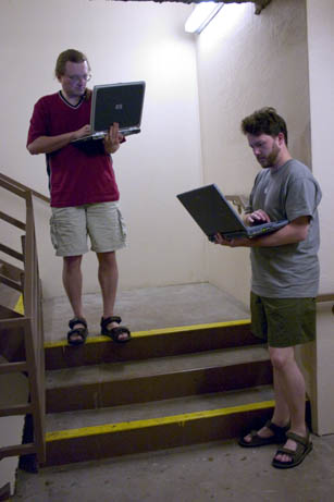 Okay, brace yourselves, here's a glimpse into the lives of geeks in hotels. What do we do when we're not out in public? Well... we've been chasing an undefended wireless connection around the hotel all week so we can get net access after the conference closes. Tongiht we finally found a decent reliable signal... on the fifth floor landing of the stairwell.